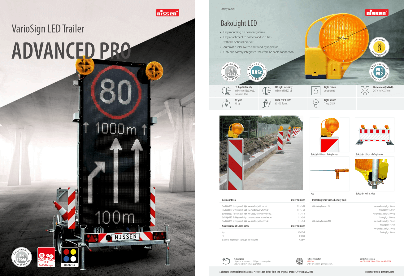 Adolf Nissen Elektrobau GmbH + Co. KG is a German manufacturer of mobile traffic management and road safety systems. The company was founded in 1914 and is headquartered in Tönning, Schleswig-Holstein. Nissen develops and produces LED variable message signs, mobile warning trailers, lamps, and intelligent traffic control systems for highways and work zones. It operates several branches across Europe, including Poland, Switzerland, Spain, and Austria. Nissen employs around 200 people and supplies public authorities, construction firms, and safety service providers. The company maintains ISO 9001, ISO 14001, and ISO 50001 certifications, ensuring high standards of quality, environmental responsibility, and energy efficiency.