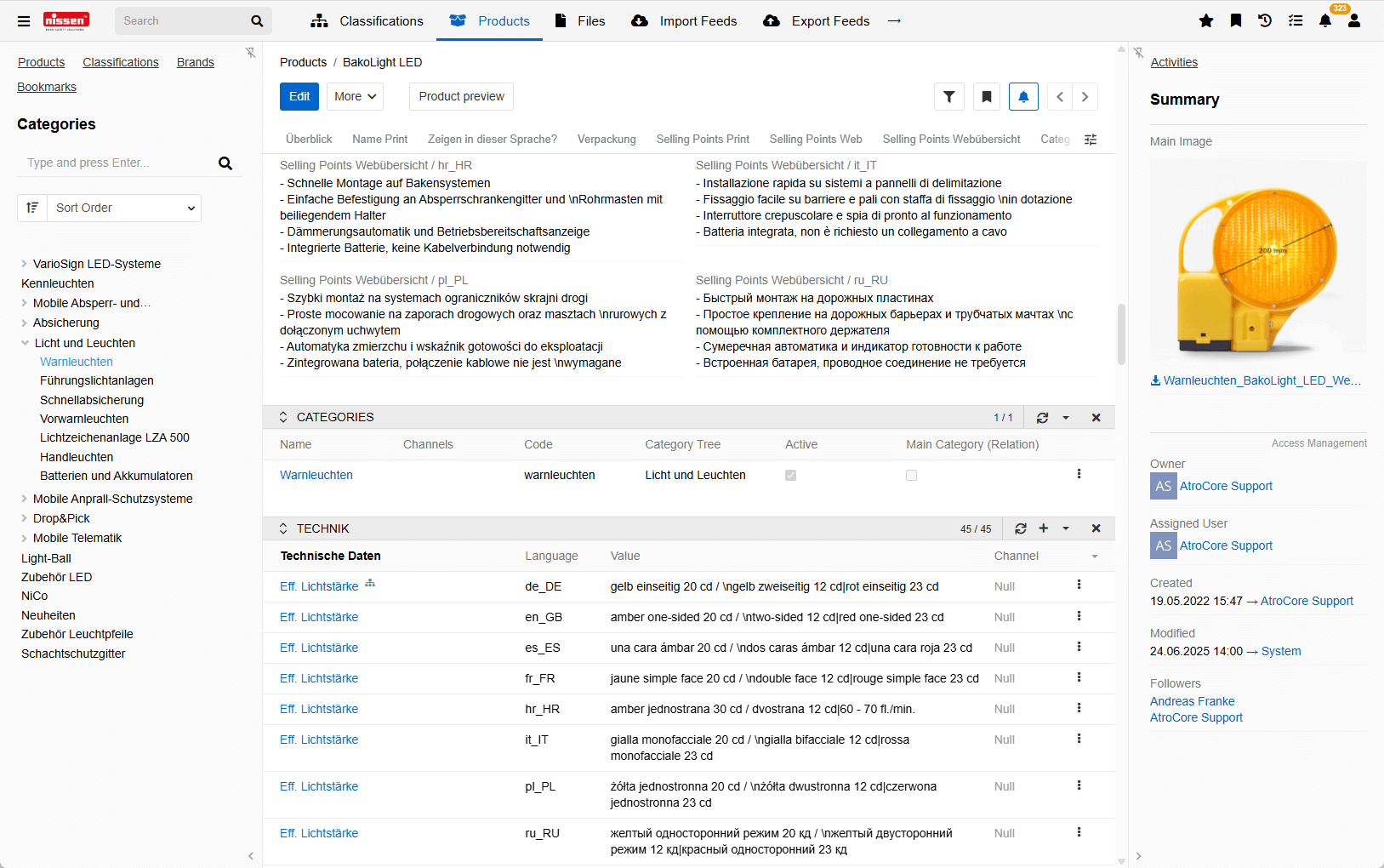 Automated Data Sheet Generation: The PIM now automates the creation of multilingual product data sheets. Configurable templates generate one- and two-page documents with consistent branding, pulling real-time data directly from the repository for international sales and marketing teams.