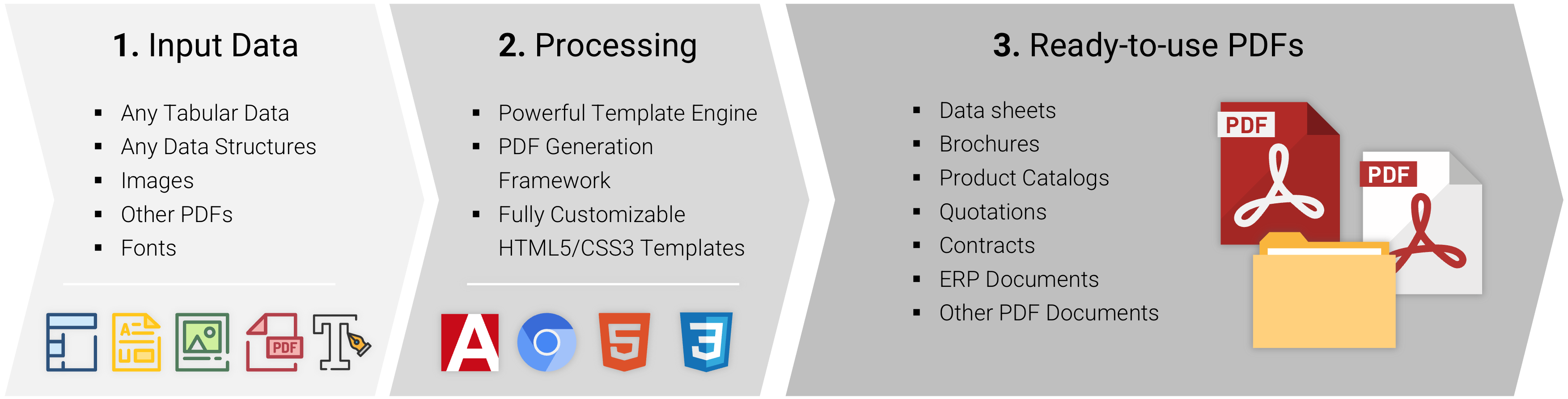 We manage the entire data preparation and integration process, followed by the development of custom HTML5/CSS3 templates tailored to your requirements. Once configured, your PDFs can be generated manually or through a fully automated, headless background process for maximum efficiency.