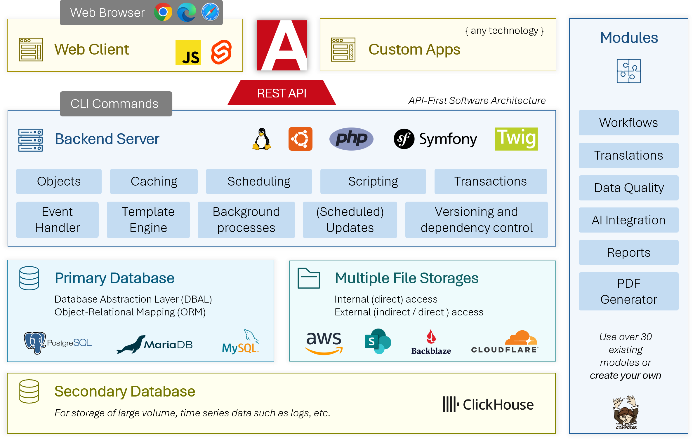 “АPI-céntrico” – AtroCore tiene una arquitectura de software centrada en la API, lo que significa que todo se hace a través de la API, incluso si haces cambios, están inmediatamente disponibles en la API.